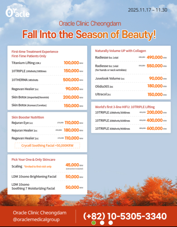 솔직히 강남 피부과 10곳 넘게 다녀봤지만, 믿고 맡길 수 있는 곳, 효과 확실한 곳, 재방문하고 싶은 곳으로 오라클만 계속 생각나요. 연예인들도 많이 온다는 소문이 그냥 소문이 아니었음...